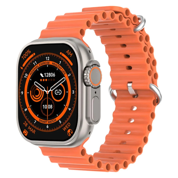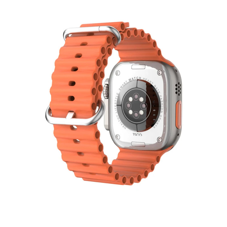 اگر میخواهید همواره از تعداد قدمها و مسافتی که طی میکنید باخبر باشید همیشه یک ساعت هوشمند به کمک شما میآید. ساعت هوشمند تسکو مدل TSW 8 ULTRA MAX یکی از جدیدترین و حرفهای ترین ساعتهای شرکت TSCO است که با رعایت استانداردهای بینالمللی کاربران خود را راضی نگاه داشته است. شرکت تسکو با رعایت کلیه قوانین مربوط به تولید ساعتهای هوشمند قدم بزرگی در راستای کمک به کاربر برای تهیه محصولی باکیفیت و مقرون به صرفه برداشته است. در ادامه با ما همراه باشید تا در این بررسی یکی از قویترین و بهترین ساعتهای هوشمند شرکت تسکو یعنی TSW 8 ULTRA MAX را به شما معرفی کنیم. ساعت TSW 8 ULTRA MAX با تلفیقی از تکنولوژی روز دنیا و طراحی حرفهای برای ارائه بهترین عملکرد ساخته شده است. این ساعت دارای فیس واچهای زیبا و جذابی بوده که استفاده از این محصول را برای کاربر تکراری نمیکند. صفحه نمایش ساعت TSW 8 ULTRA MAX با ابعاد 2.1 اینچ از نوع IPS با قابلیت نمایش تمامی رنگها نمایشگر 4 ضلعی دارد که رزولوشن آن به 320×385 میرسد. جنس خود ساعت از آلیاژ زینک و IML بوده و از مقاومت نسبتاً خوبی برخوردار است. سایز بند ساعت هوشمند جذاب تسکو 21.5 میلیمتر بوده و از جنس سیلیکون تولید میشود. ابعاد خود ساعت برابر 49×43×11.5 بوده که با وزن 46 گرم در طول روز به هیچ عنوان باعث خستگی در دستان شما نخواهد شد. رنگهایی که برای بند این ساعت در نظر گرفته شده مشکی، خاکستری و نارنجی بوده که با رنگ مشکی و نارنجی برای خود ساعت جذابیت بصری زیادی به وجود میآورد. اقلام همراه TSW 8 ULTRA MAX شامل 2 بند، شارژر وایرلس، دفترچه راهنما و جعبه است. ساعت خود را با گوشی هماهنگ کرده و از کاربردهای متفاوت آن لذت ببرید. . شیشه نمایشگر ساعت TSW 8 ULTRA MAX ضد شکستن بوده و میتوانید از مقاومت آن اطمینان حاصل کنید.