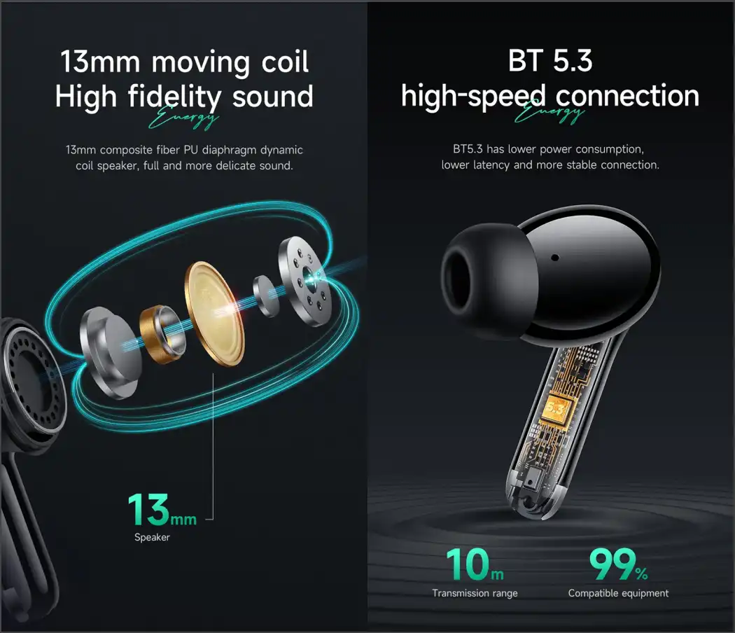 یکی از ویژگیهای برجسته این مدل، قابلیت حذف نویز محیطی (ENC) است. این فناوری به کاهش صدای محیط در هنگام مکالمه یا پخش موسیقی کمک میکند تا تجربه شنیداری بینقصی داشته باشید.
